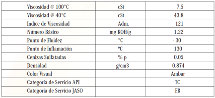 Formulado especialmente para la lubricación de los motores de motocicletas y otras máquinas con motores de dos tiempos enfriados por aire (motosierras, cortadoras de grama y otros). Se usa mezclado con la gasolina generalmente en proporción de 1:20 en volumen. Se recomienda consultar el manual del vehículo o equipo para la proporción correcta. No se recomienda para la lubricación de motores de dos tiempos a gasolina enfriados por agua.