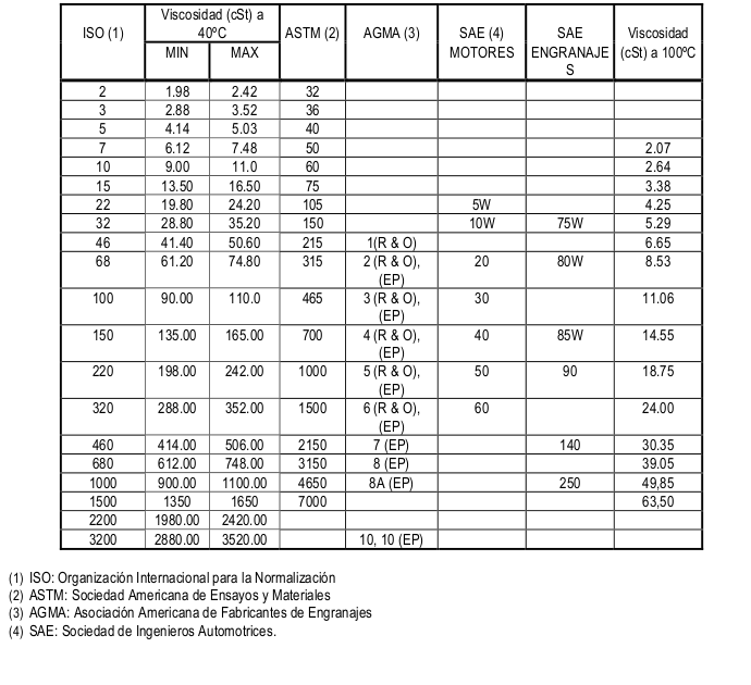 Desde que el petróleo y sus derivados empezaron a jugar un papel importante en el avance de la industria, se hizo necesaria la creación de un vocabulario que le permitiera tanto a los productores como a los consumidores finales definir claramente propiedades de los aceites lubricantes. En este sentido, se han adoptado distintos sistemas para clasificar la viscosidad de los lubricantes líquidos industriales basados en la medición de la viscosidad en distintas unidades y diferentes métodos, lo cual llevaba a que continuamente se emplearan tablas de conversión para pasar de un sistema de viscosidad a otro. Por ejemplo, un aceite lubricante grado ISO 220 corresponde a un grado SAE 50, SAE 90, ASTM 1000, AGMA 5 y tendría aproximadamente una viscosidad de 18,75 cSt medida a 100 oC.