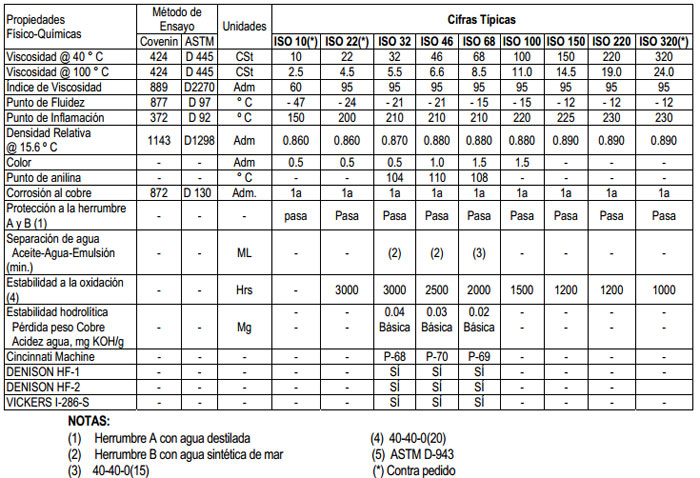 Aceite mineral elaborado con básicos de primera calidad y aditivos que le confieren propiedades antioxidantes, antidesgaste, antiespumantes y protectoras contra la herrumbre. Posee gran estabilidad química y alto índice de viscosidad por lo que lubrica satisfactoriamente a diversas condiciones de operación y temperatura. Cumple con los requerimientos de fabricantes de equipos DENISON HF-1 y HF-2, y VICKERS I-286-S, así como también los requisitos de las especificaciones P-68 (ISO 32), P-69 (ISO 68) y P-70 (ISO 46) de CINCINNATI MACHINE. Satisface la norma venezolana COVENIN 899-1 y posee el sello de calidad NORVEN.