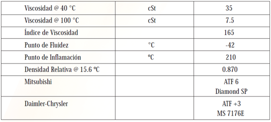 Lubricante formulado con aceites básicos refinados y de gran estabilidad térmica a los cuales se les han añadido mejoradores del índice de viscosidad, agentes antidesgaste, antioxidantes, antiherrumbrante y antiespumantes. Este aceite cumple con los requisitos de la especificación ATF-6 de Mitsubishi Motors Company.