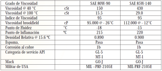 Lubricante elaborado con básicos altamente refinados a los cuales se le añaden aditivos de Extrema Presión (EP), antiherrumbrante, antioxidantes y un aditivo que mejora sus propiedades viscométricas convirtiéndolo en multigrado. Cumple con las exigentes especificaciones API MT-1 y GL-5, Mack GO-J y MIL-PRF-2105E. Satisface la norma venezolana Covenin 987-2 y posee el sello de calidad NORVEN. Ofrece las siguientes ventajas: 1. Disminuye el consumo de combustible en el vehículo. 2. Su característica de grado múltiple permite cubrir todos los grados de viscosidad SAE recomendados por los fabricantes de engranajes automotores. 3. Sustituye ventajosamente el uso de los grados tradicionales SAE 90 y 140 para engranajes automotores. 4. Provee la fluidez necesaria a bajas temperaturas previniendo así el contacto metal / metal en los engranajes del vehículo durante el arranque en frío. 5. Ofrece la protección de los grados SAE tradicionales, 90 ó 140, cuando se alcanzan las temperaturas normales de operación. 6. Brinda una mayor protección de los engranajes durante condiciones severas de manejo del vehículo. 7. Dadas sus características termoestables permite un periodo de servicio prolongado, protegiendo los engranajes.